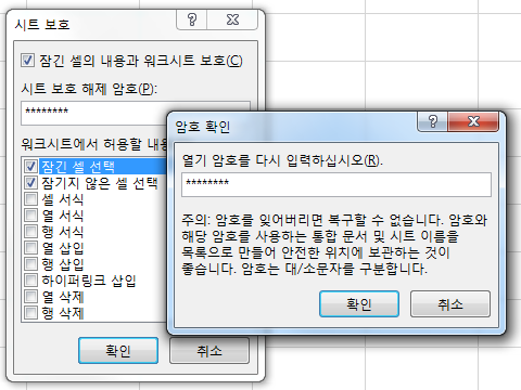 시트 보호 암호를 입력하고 [확인] 버튼을 누릅니다.