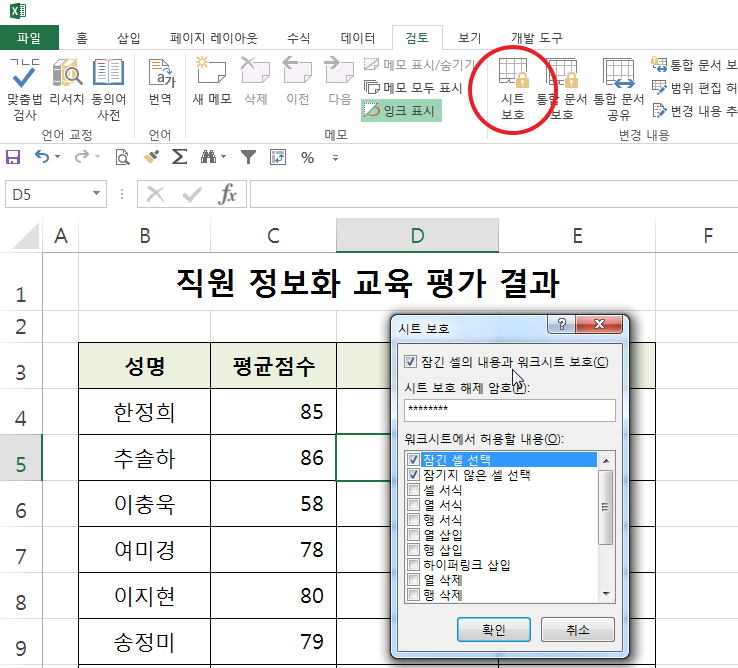 잠금 처리를 해제한 후 [검토]-[시트 보호] 메뉴를 실행하고 시트 보호 암호를 입력하고 보호를 합니다.