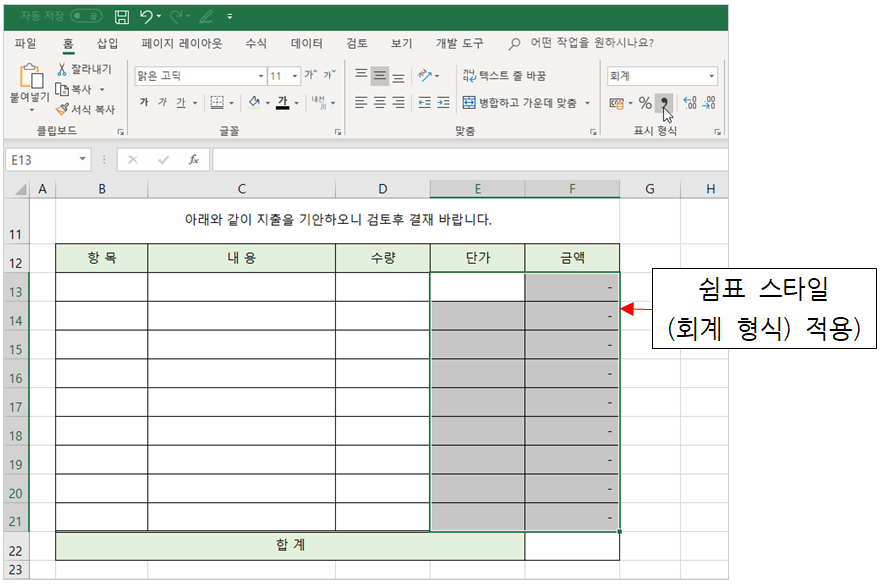 4. 단가와 금액 범위 [E13:F21]을 선택하고 [홈] 탭 → [표시 형식] 그룹 → [쉼표 스타일]을 적용합니다.