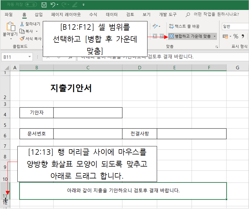 [B11:F11] 셀 범위를 선택하고 [홈] 탭 → [맞춤] 그룹 → [병합하고 가운데 맞춤]을 적용하고 행 높이도 아래와 같이 변경합니다.