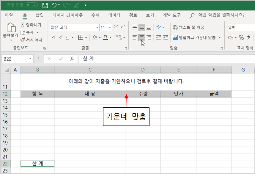 12. [B22:E22] 셀 범위를 선택하고 [홈] 탭 → [맞춤] 그룹 → [병합하고 가운데 맞춤]을 적용합니다.