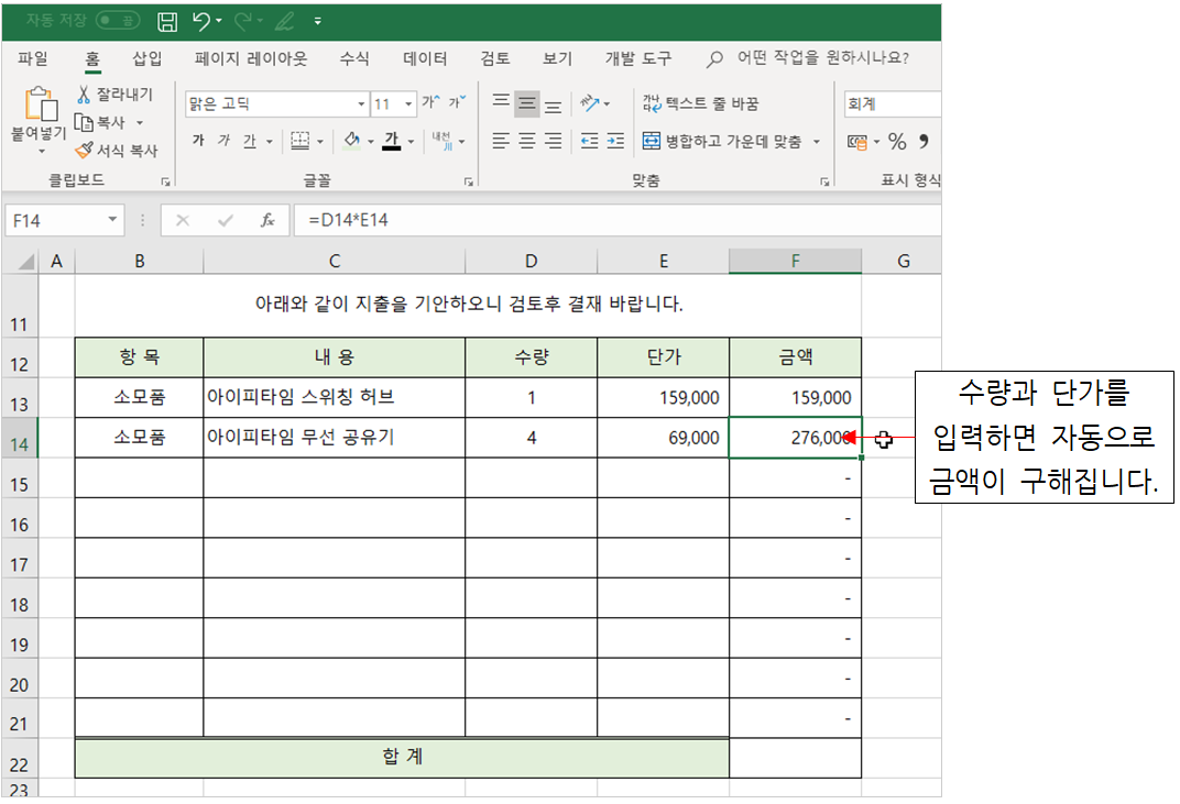 양식에 미리 수식을 작성해 두고 값을 입력하면 자동으로 계산이 되도록 하고 결재란을 만들어 사용하는 기능을 추가해서 소개하겠습니다.