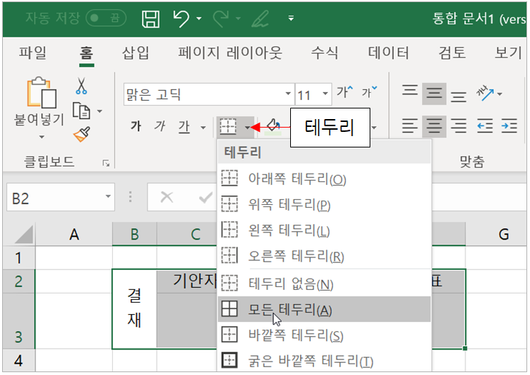 6. 테두리를 [글꼴] 그룹 → [테두리 ▼] → [모든 테두리]를 선택합니다.