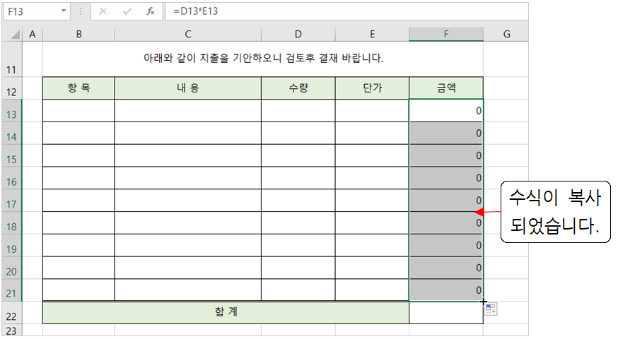 이제 계산표를 작성할 차례입니다. 항목과 내용, 단가와 수량을 입력하면 금액과 금액의 합계가 구해지도록 수식을 작성해 보겠습니다.