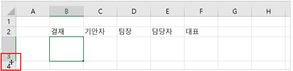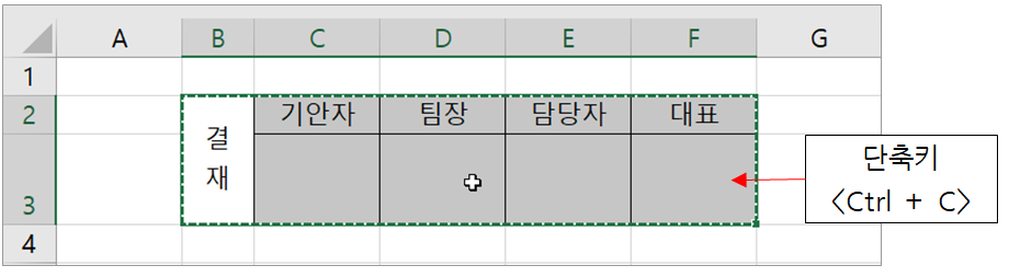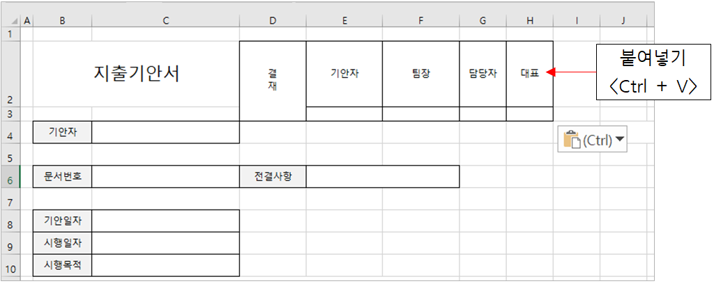 결재란은 총 5칸으로 구성되어 있는데 ‘지출기안서’에 붙여 넣을 공간은 열이 3개 밖에 안 됩니다.