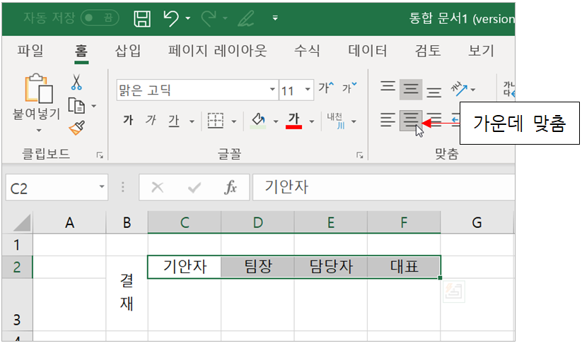 5. 이번에는 [C2:F2] 셀 범위를 선택하고 [홈] 탭 → [맞춤] 그룹 → [가운데 맞춤]을 선택합니다.