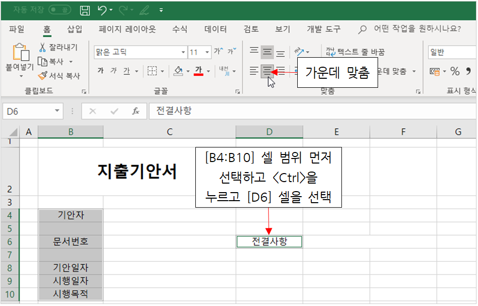 4. 아래와 같이 [B4:B10] 셀 범위와 [D6] 셀을 선택하고 [가운데 맞춤]을 적용합니다.