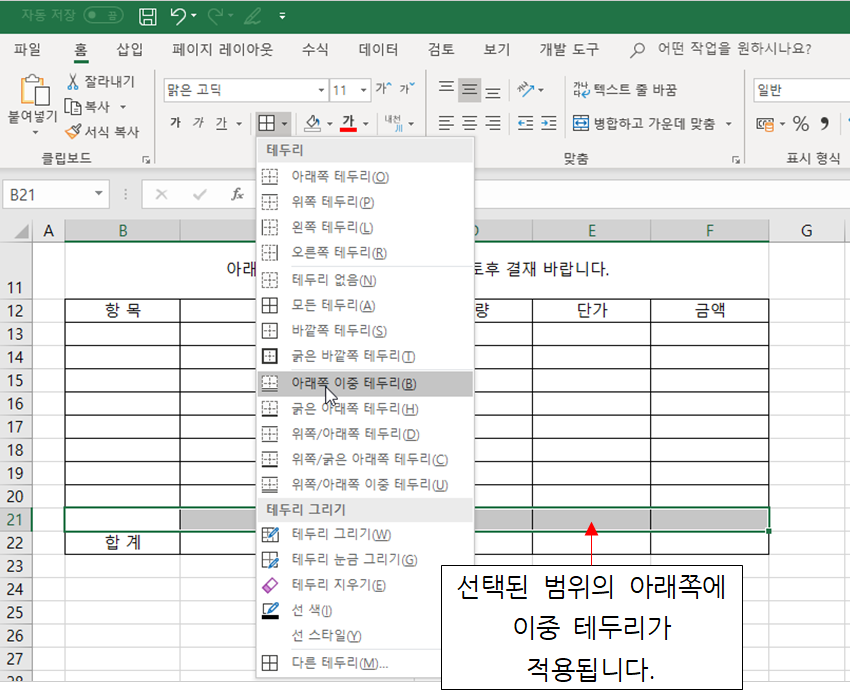 11. [B21:F21] 셀 범위를 선택하고 [홈] 탭 → [글꼴] 그룹 → [테두리 ▼] → [모든 테두리] → [아래쪽 이중 테두리]를 적용합니다.
