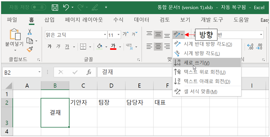 3. 병합된 [B2] 셀을 그대로 선택한 상태에서 [홈] 탭 → [맞춤] 그룹 → [방향] → [세로 쓰기]를 선택합니다.