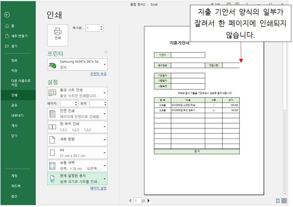 지출기안서 양식만 용지에 인쇄되도록 먼저 인쇄 영역을 설정하겠습니다.