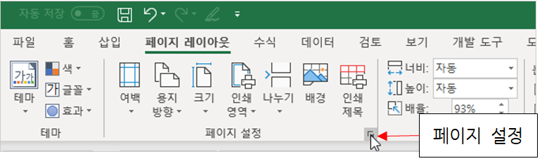 [페이지 레이아웃] 탭 → [페이지 설정] 그룹 → [페이지 설정]을 선택합니다.