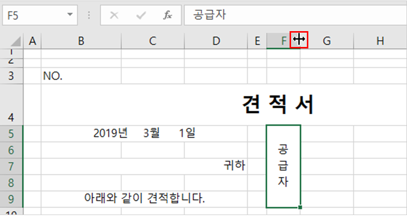 4. [F5] 셀에 ‘공급자’ 라고 입력하고 [홈] 탭 → [맞춤] 그룹 → [병합하고 가운데 맞춤]을 적용하고 [방향] → [세로 쓰기]를 선택하고 [F] 열 너비를 줄여줍니다.