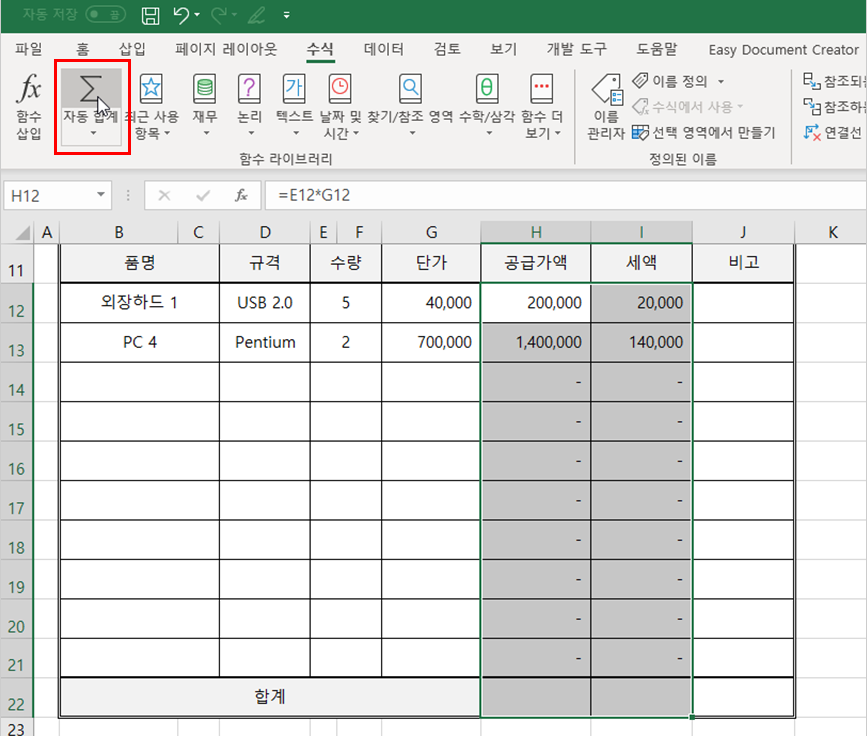 이제 견적서에 항목을 입력하면 바로 계산이 되도록 수식을 넣어 보겠습니다.