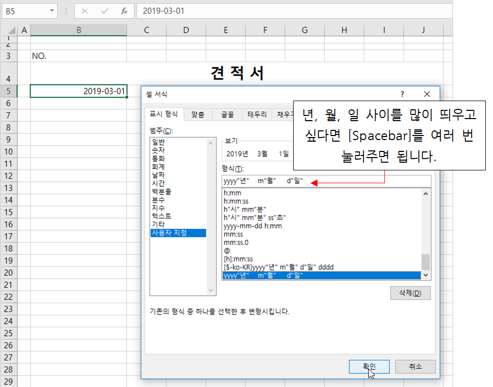 견적서에 제목과 날짜 입력하기