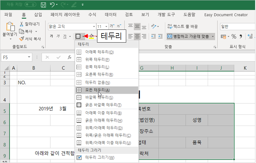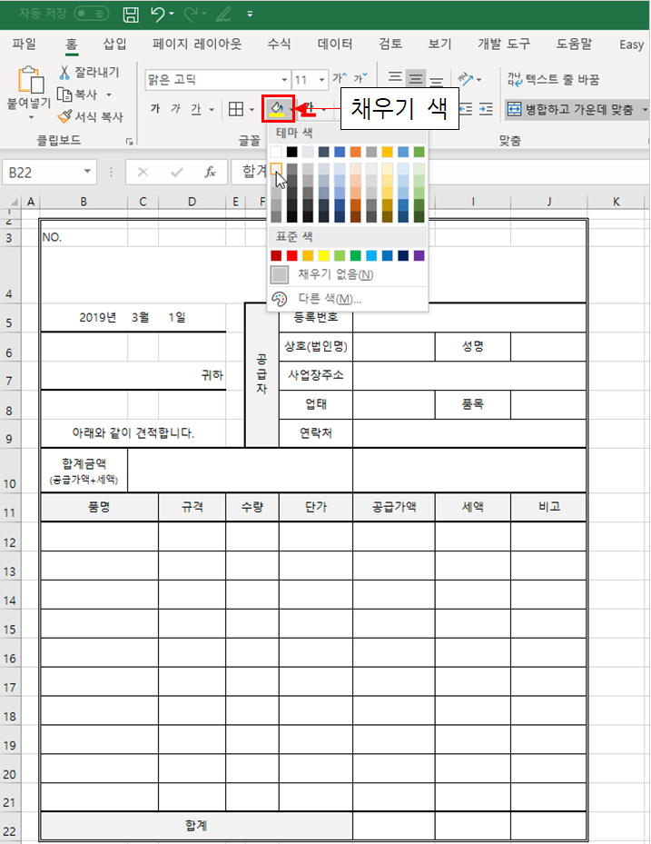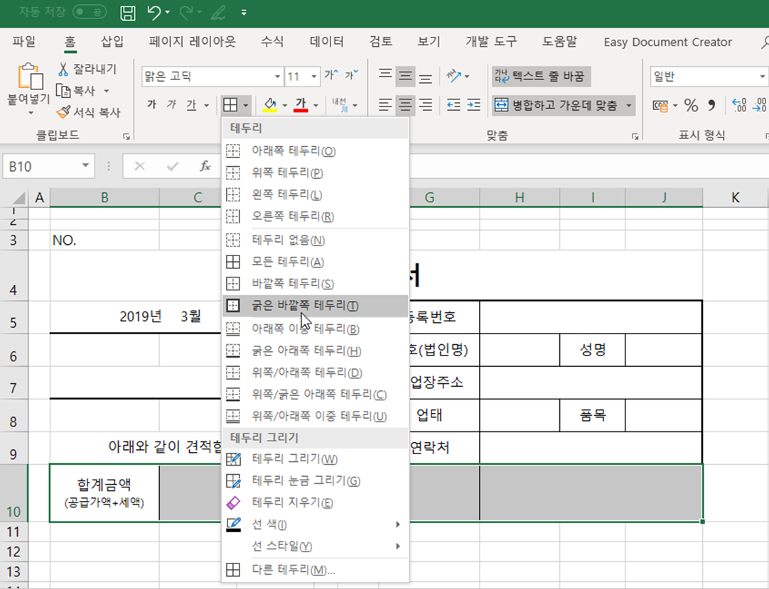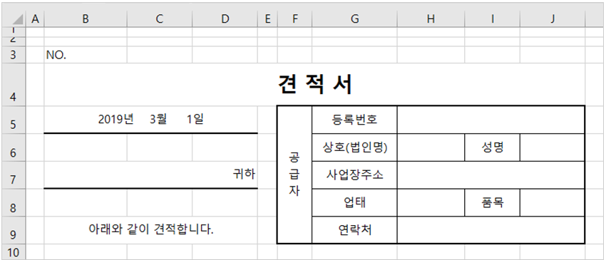 이번 강좌는 지난 시간에 이어 두번째 양식, 견적서 만들기 차례입니다.