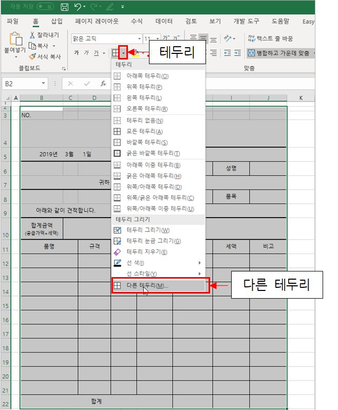 견적서 전체 범위 [B2:J22] 셀 범위를 선택하고 [홈] 탭 → [글꼴] 그룹 → [테두리] → [다른 테두리]를 선택합니다.