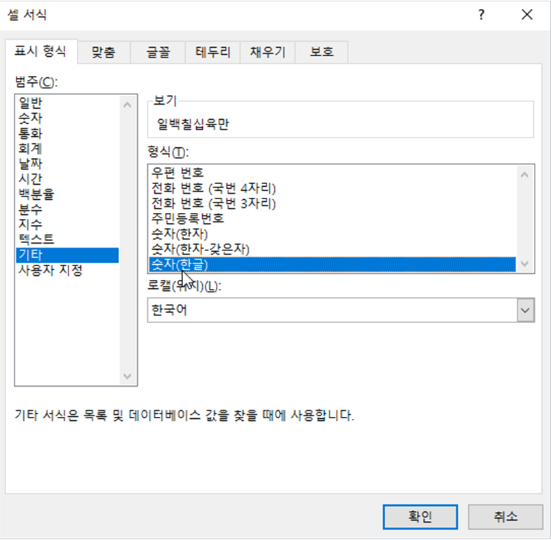 [표시 형식] → [기타] 범주 → [숫자(한글)] 을 선택합니다 .