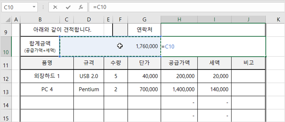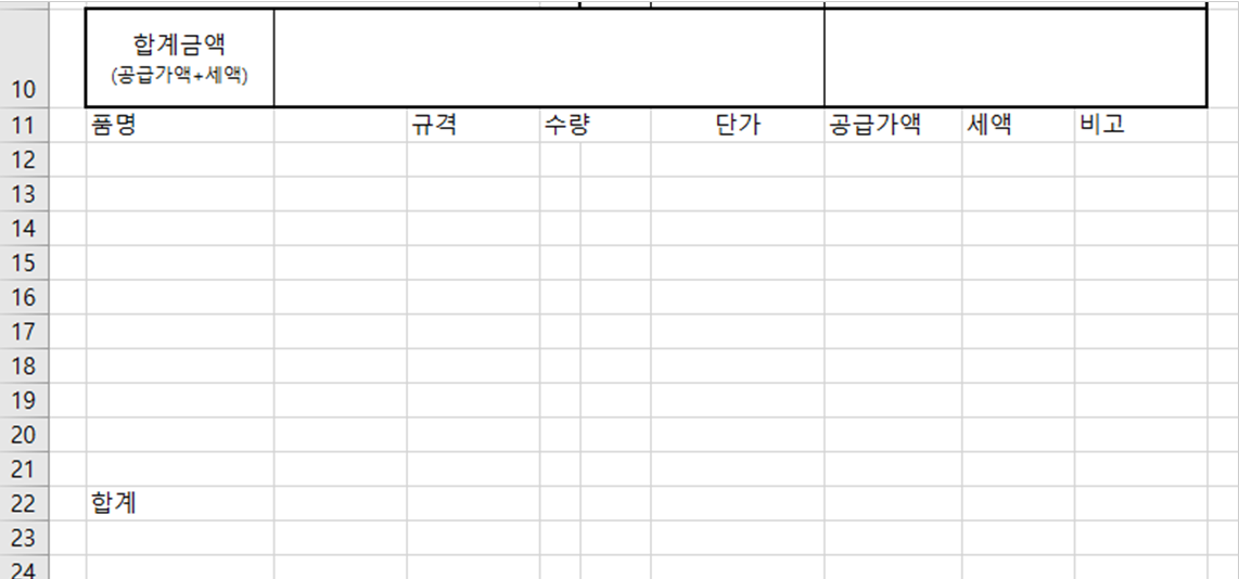 5. 공급가액과 세액을 더해 합계금액을 구하겠습니다. [C10] 셀에 [H22] 셀에 [I22] 셀을 더해줍니다.