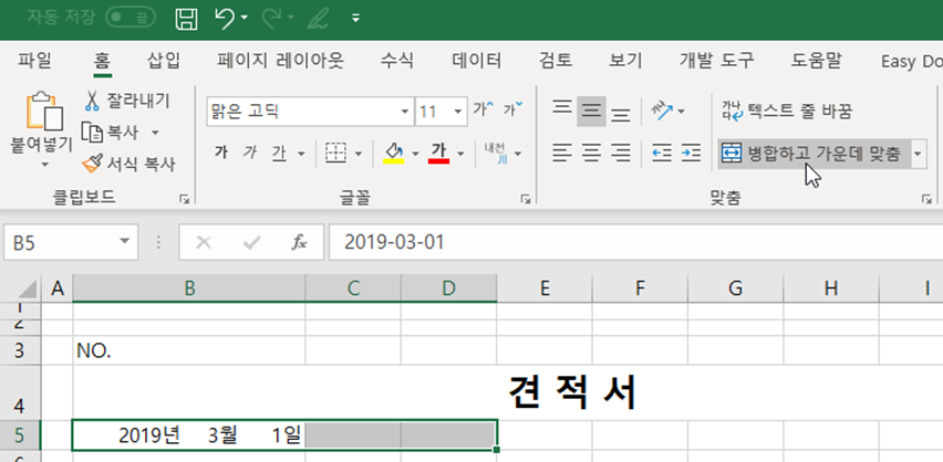 4. [B5:D5] 셀 범위를 선택하고 [홈] 탭 → [맞춤] 그룹 → [병합하고 가운데 맞춤]을 선택합니다.