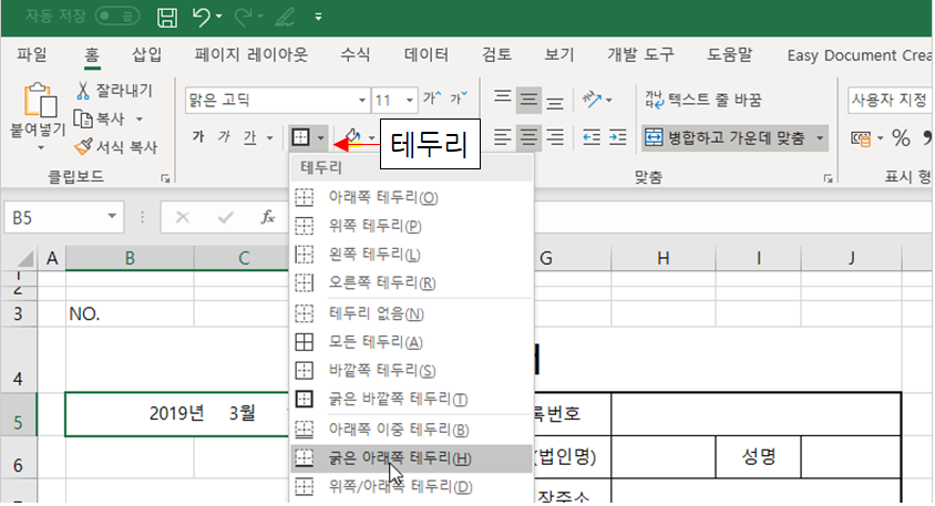 9. [B5] 셀을 선택하고 [홈] 탭 → [글꼴] 그룹 → [테두리] → [굵은 아래쪽 테두리]를 선택합니다.