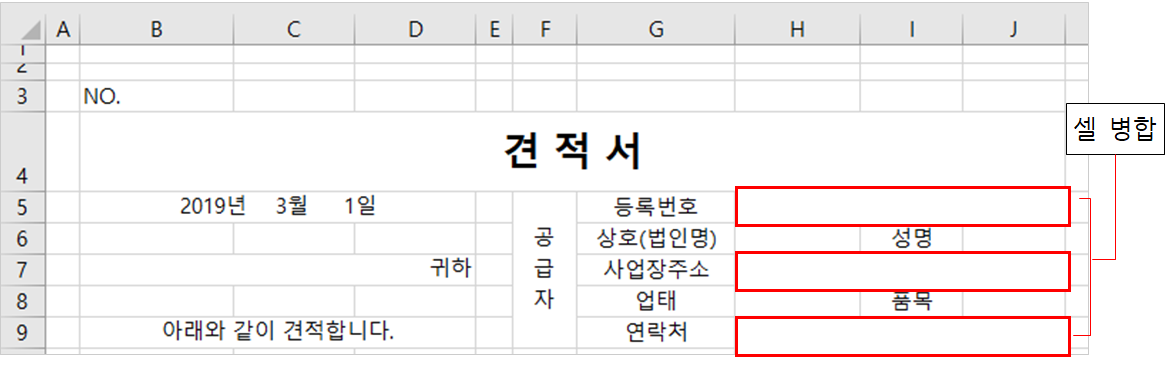 7. 품명과 수량 범위는 두개의 열에 걸쳐서 작성이 되어 있기 때문에 셀들을 각각 합쳐줘야 합니다.