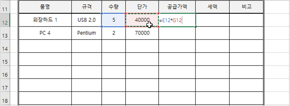 그런 다음 공급가액을 구할 [H12] 셀을 선택하고 =을 입력하고 [E12] 셀을 선택하고 *(곱하기)를 입력한 다음 [G12] 셀을 선택한 다음 <Enter>를 누릅니다.