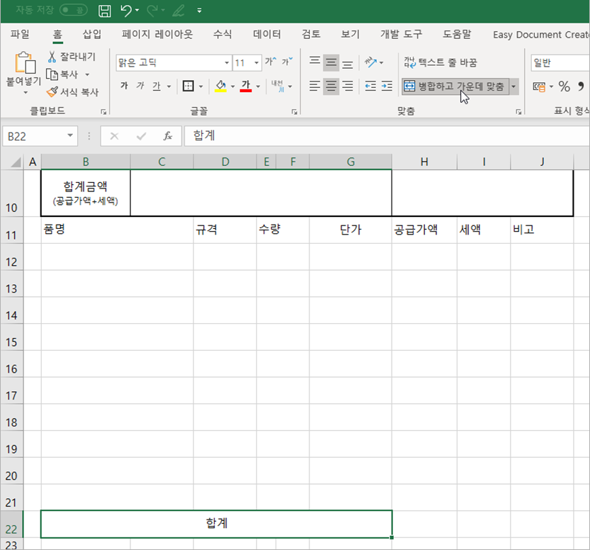 마지막으로 [B22] 셀에 ‘합계’라고 입력합니다.