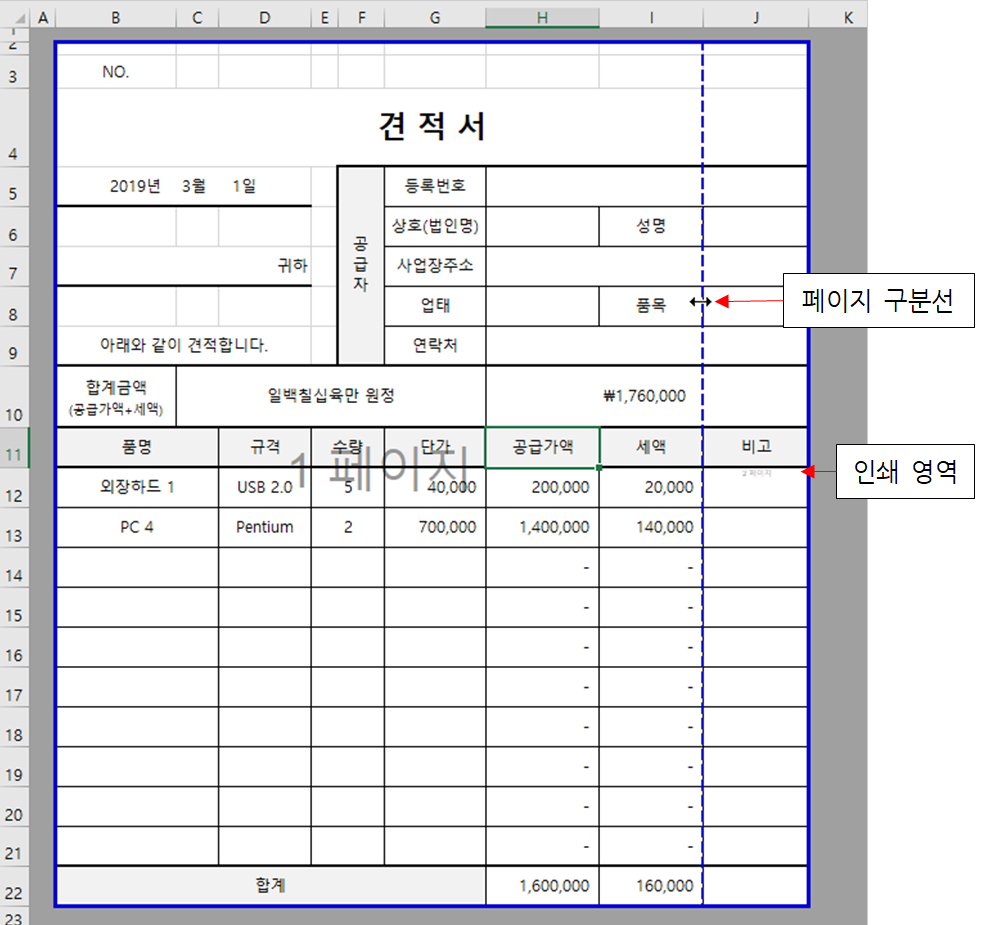 페이지 나누기 미리보기 상태에서 페이지 구분선을 오른쪽으로 끌어 견적서 양식이 ‘1 페이지’ 영역에 모두 포함되도록 설정합니다.