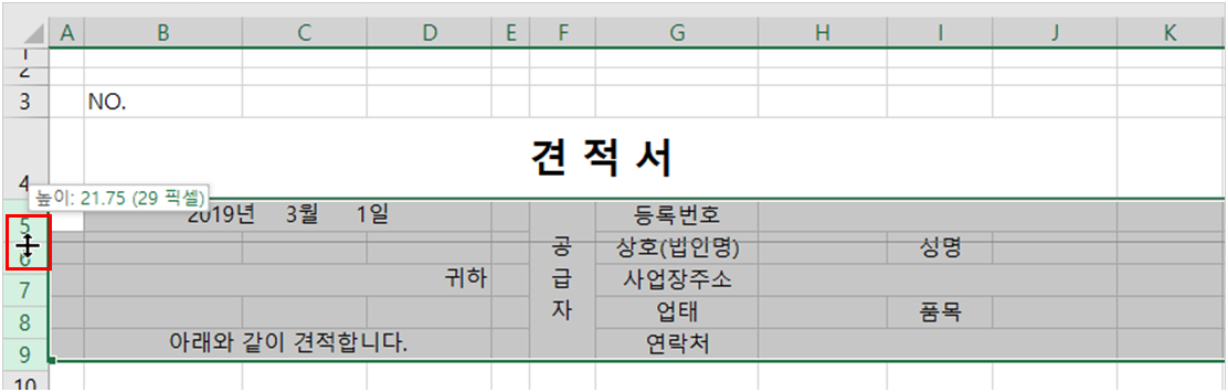그리고 ‘견적서’가 입력된 [4] 행의 높이도 늘려줍니다.
