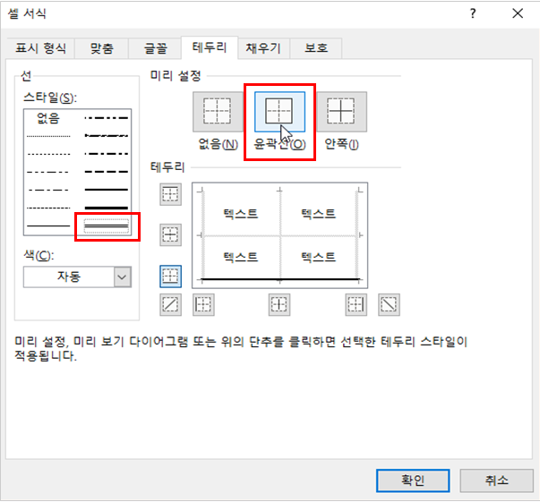 [선] → [스타일] 범주에서 ‘이중 테두리’를 선택하고 [미리 설정] 범주에서 ‘윤곽선’을 선택한 다음 [확인] 버튼을 클릭합니다.
