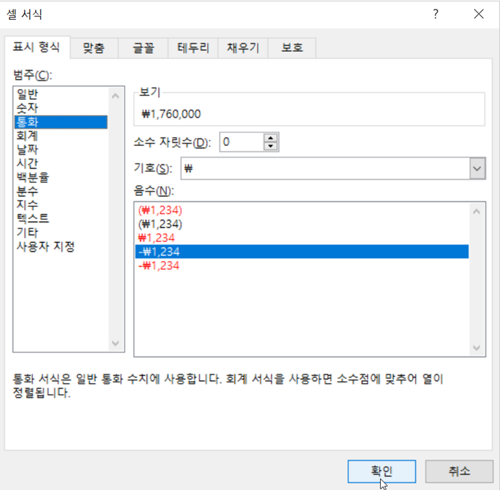 3. [H10] 셀을 선택하고 [표시 형식] → [통화]를 선택하고 [확인] 버튼을 클릭합니다.