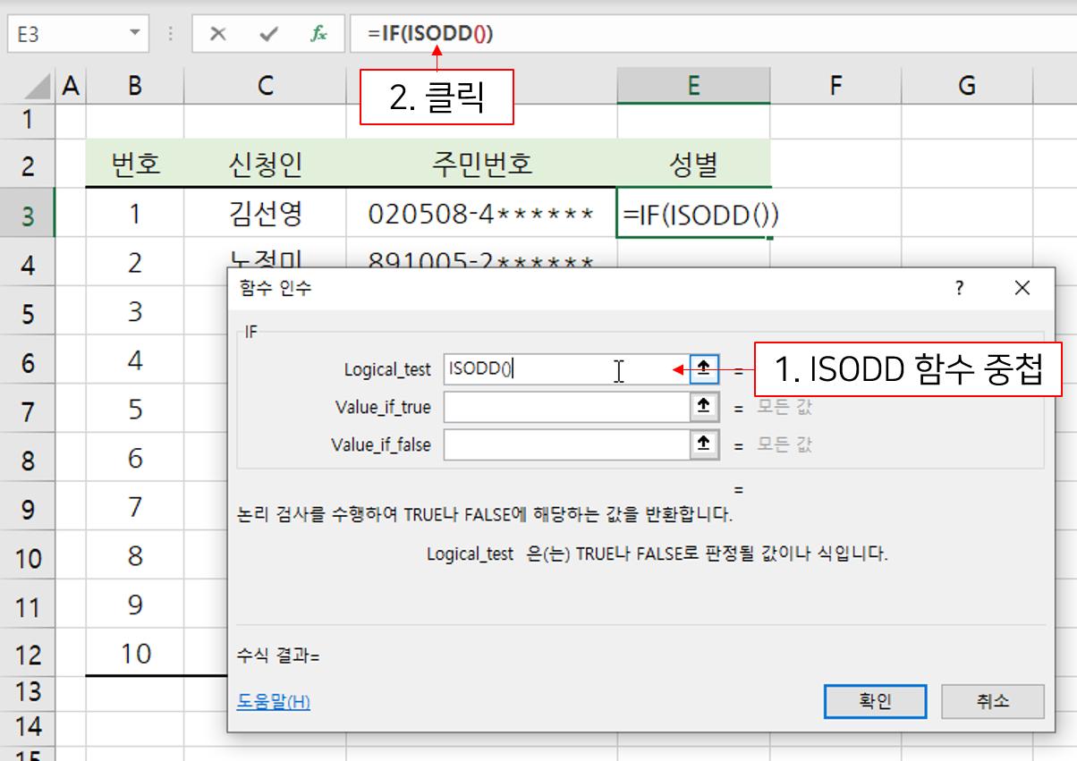 2. 짝수인지 홀수인지를 구분해주는 ISEVEN(짝수) 또는 ISODD(홀수) 함수 중에 하나를 사용.