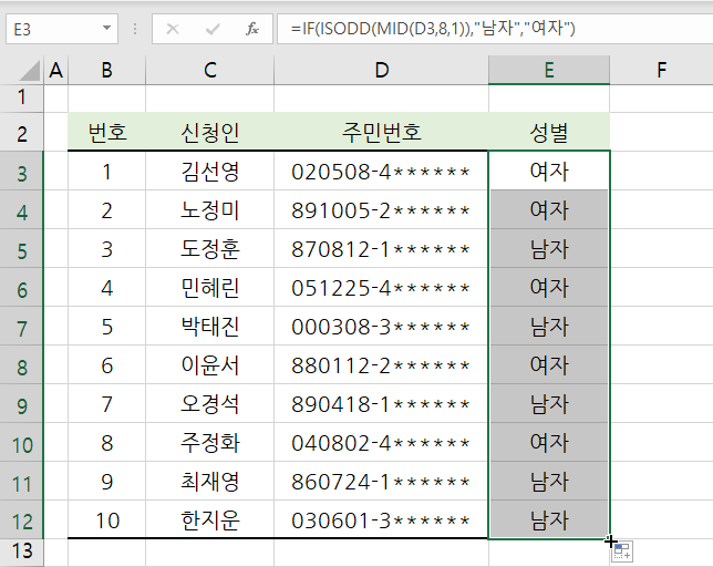 이렇게 3개 함수를 중첩하여 성별을 구할 수 있습니다.