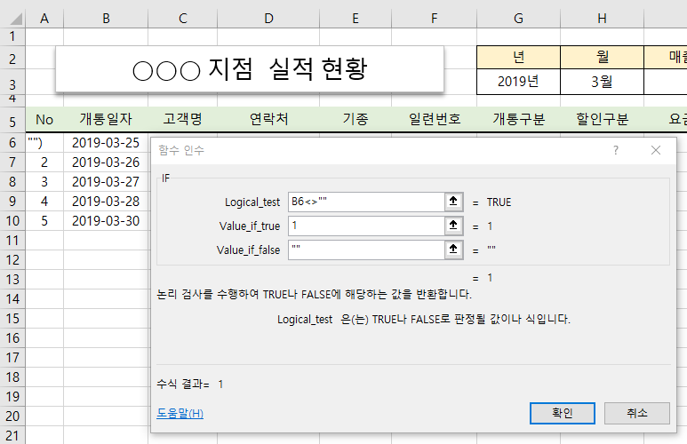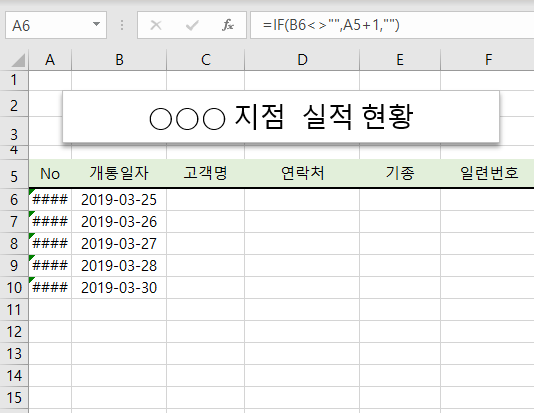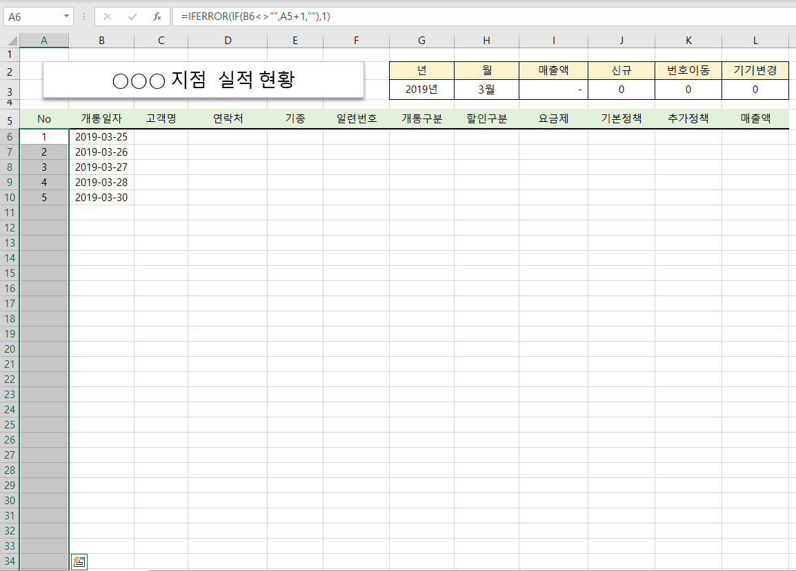 개통일자 별로 실적을 정리 하고 있는데 개통 일자를 입력하면 일련번호(No)가 자동으로 입력되도록 해보겠습니다.