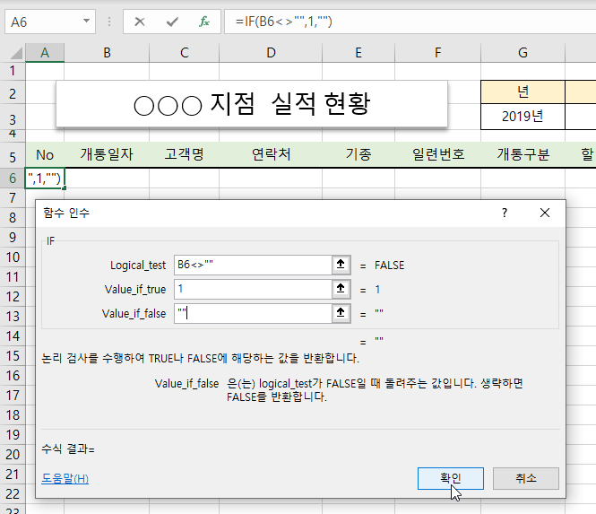 조건이 참이면 Value_if_true 인수는 1이 되고 거짓이면 Value_if_false 인수는 “”을 입력하고 [확인] 버튼을 클릭합니다.