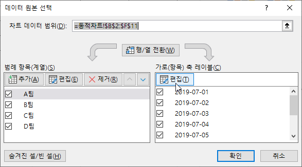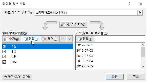 같은 방법으로 B팀을 선택하고 [편집] 버튼을 눌러 계열 값을 지정합니다.