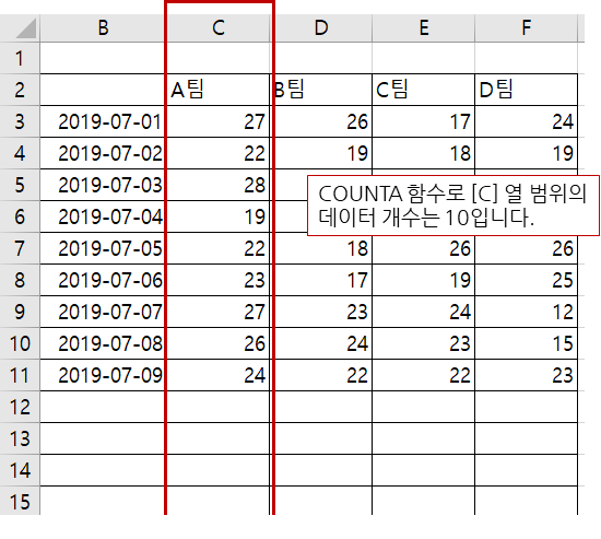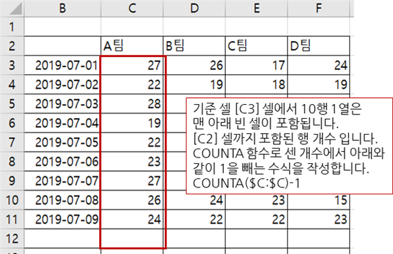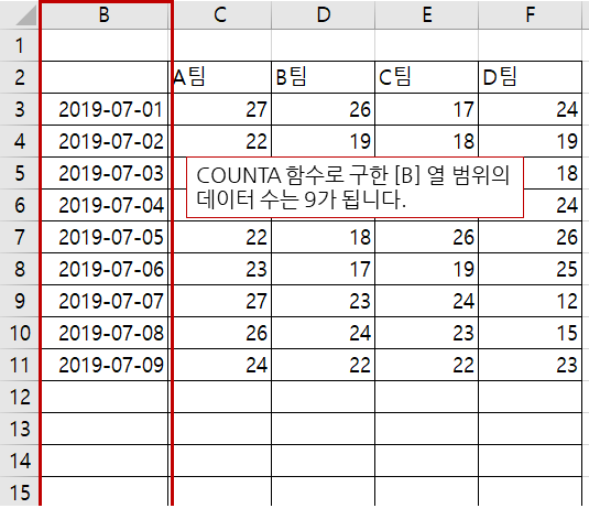 COUNTA 함수가 B열 전체 개수를 셉니다.