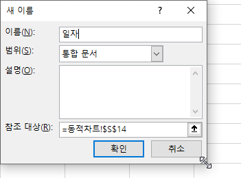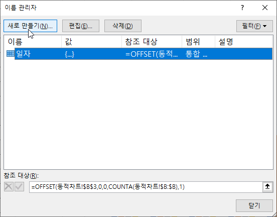 2. [새 이름] 대화 상자가 실행되면 이름 입력창에 일자를 입력하고 참조 대상 입력창에 클릭합니다.