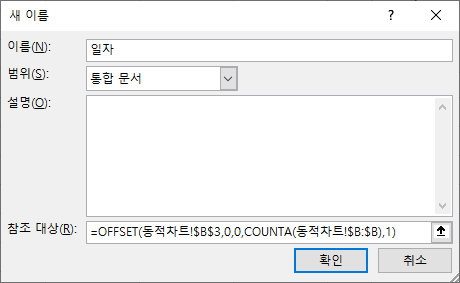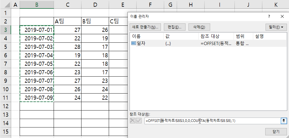 다시 수식을 확인해 보면 =OFFSET(동적차트!$B$3,0,0,COUNTA(동적차트!$B:$B),1)