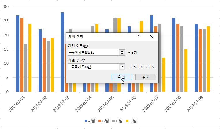 계열 값 입력창에 =동적차트!A팀을 입력하고 [확인] 버튼을 클릭합니다.