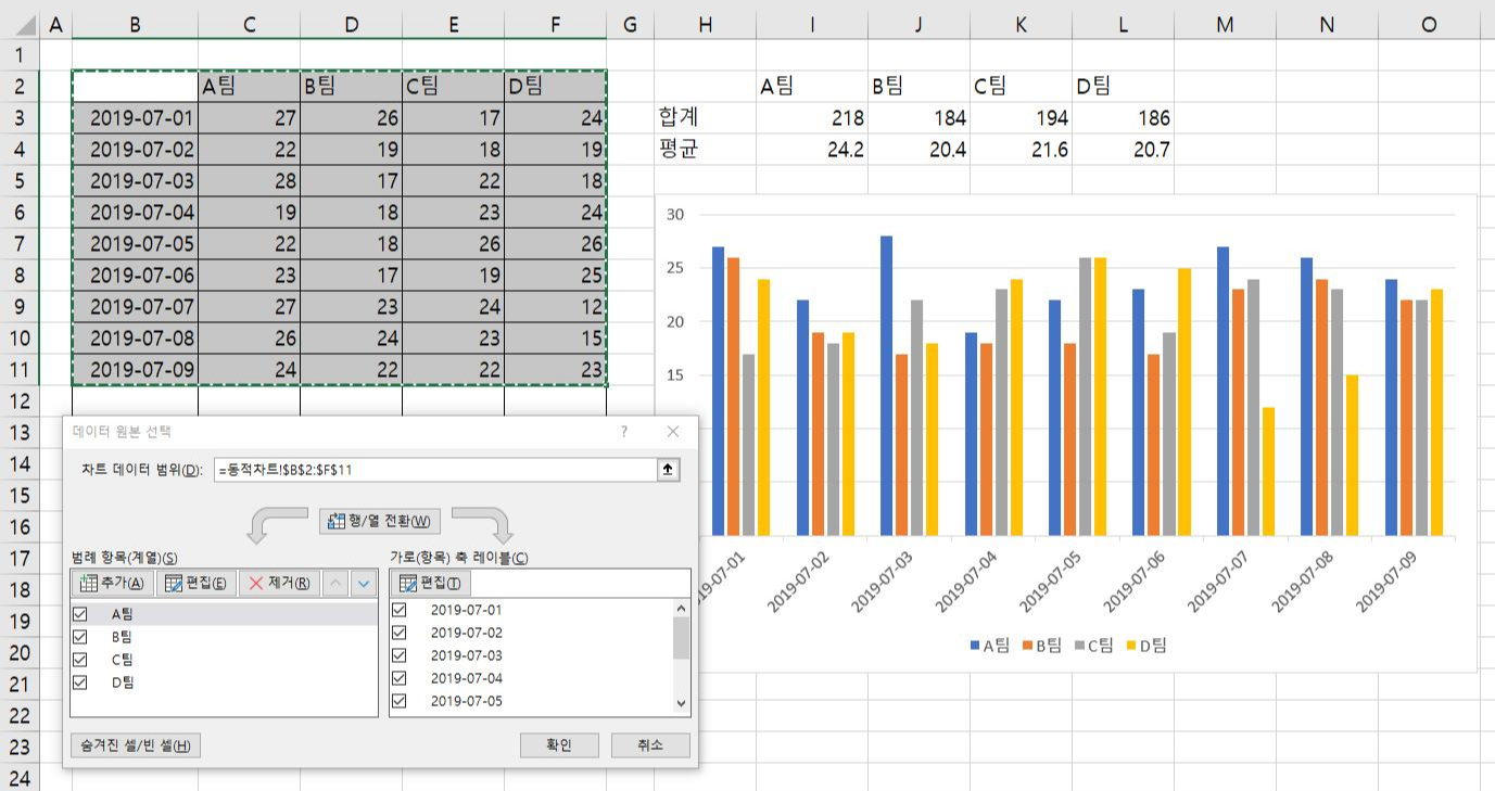 단순하게 차트 데이터 범위를 지정하고 차트를 만들면 지금처럼 자동으로 범례 항목(계열)과 가로(항목) 축 레이블이 구분되어 작성되지만, 차트 데이터 범위를 동적 범위로 지정한다고 해서 차트가 변하지는 않습니다.
