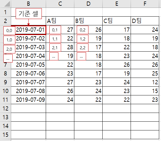 기준 셀이 이름을 지정할 시작 셀이므로 행과, 열의 상대 번지는 0입니다.
