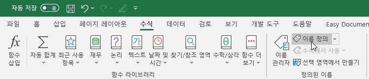 1. [수식] 탭 → [정의된 이름] 그룹 → [이름 정의]를 선택합니다.