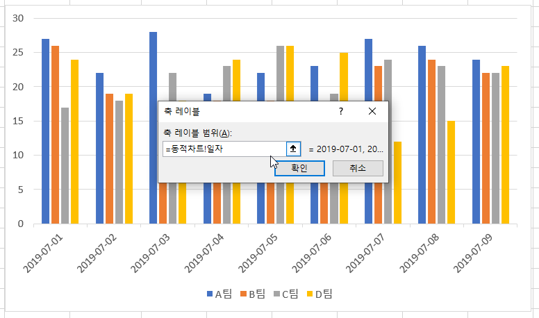축 레이블 범위 입력창에 =동적차트!일자를 입력하고 [확인] 버튼을 클릭합니다.