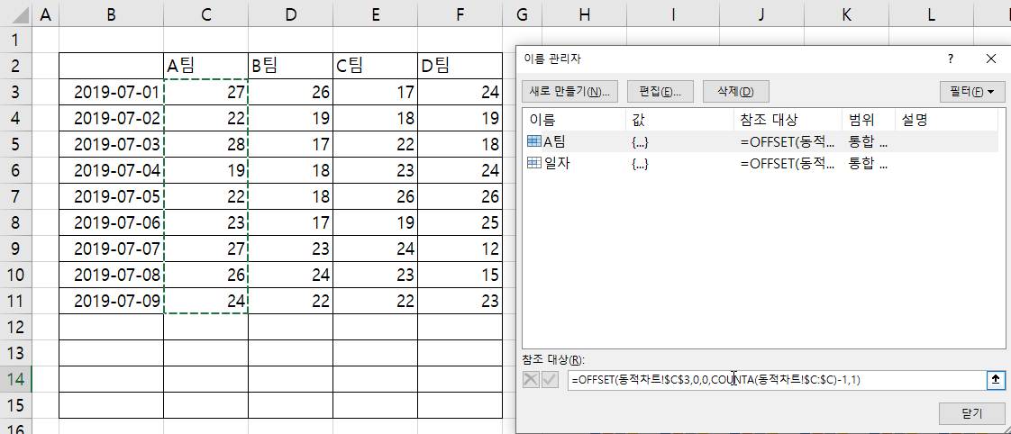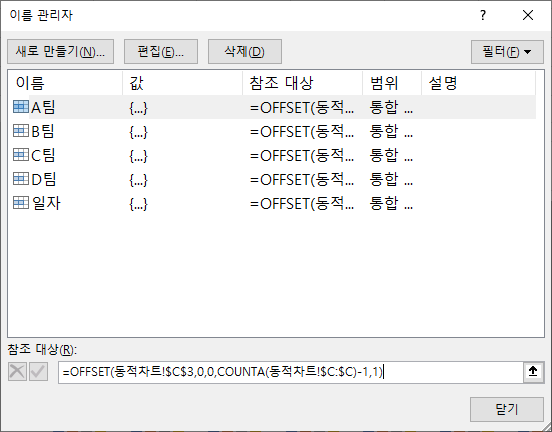 같은 방법으로 A팀에서 D팀까지 동적 범위를 이름으로 정의해보겠습니다.