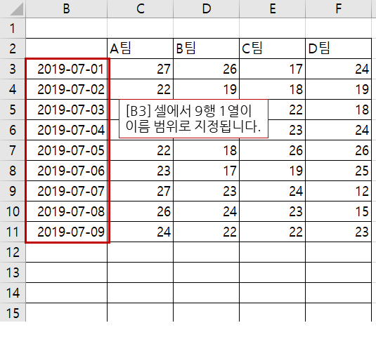기준 셀 [B3]에서 9행, 1열이 이름 범위로 지정됩니다.