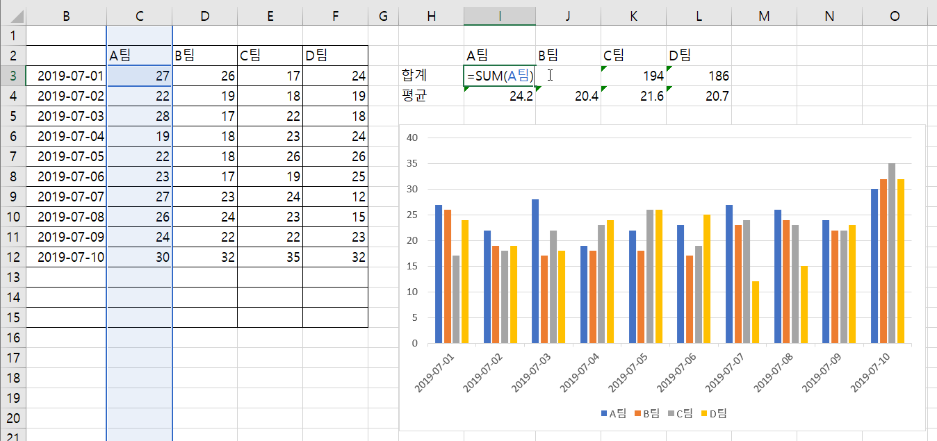 =SUM(A팀)으로 수식을 수정하면 데이터가 추가되거나 삭제될 때 자동으로 변경됩니다.