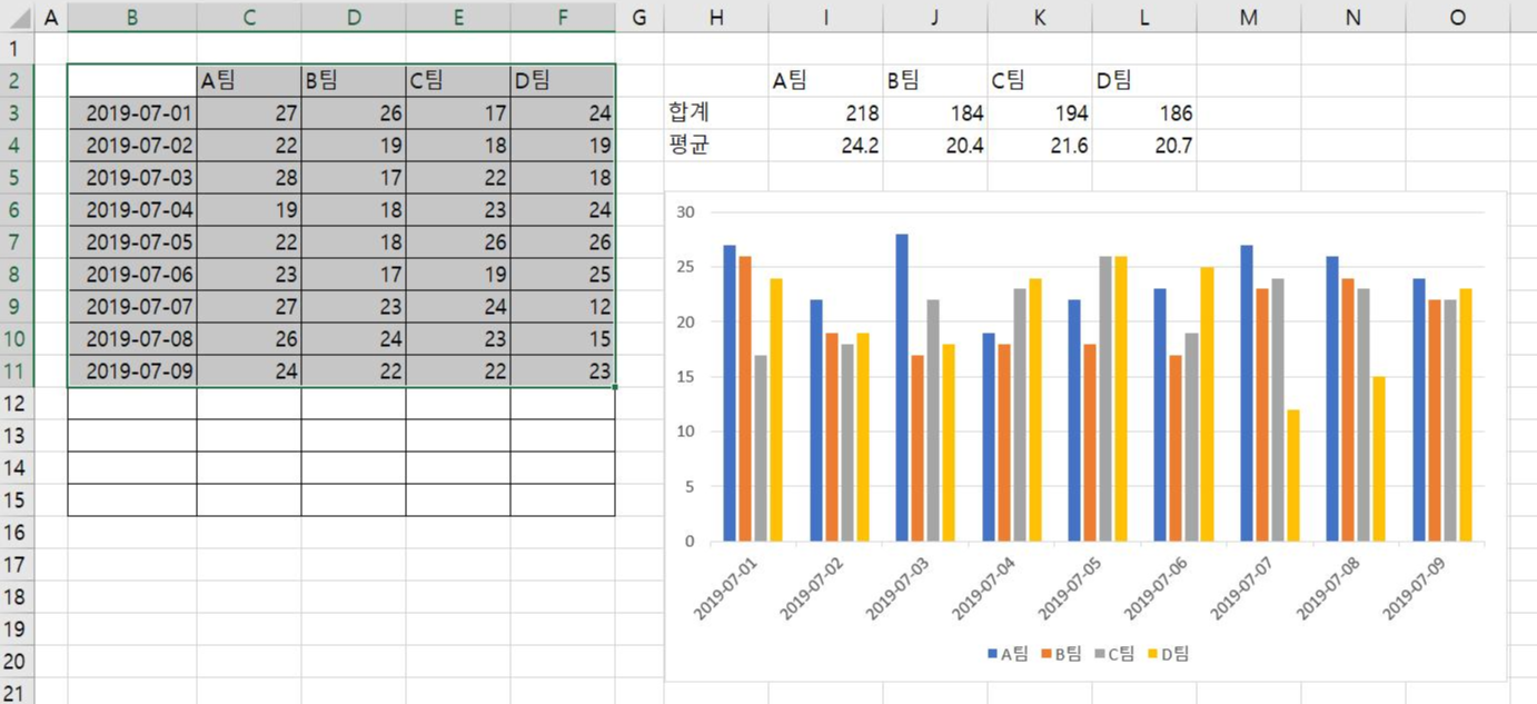 원본으로 사용한 데이터 표의 행(일자)이 열(팀명) 보다 항목수가 많아 가로(항목) 축이(항목) 일자가 되고 팀명이 범례 항목(계열)으로 (계열) 표시되어 작성되었습니다.