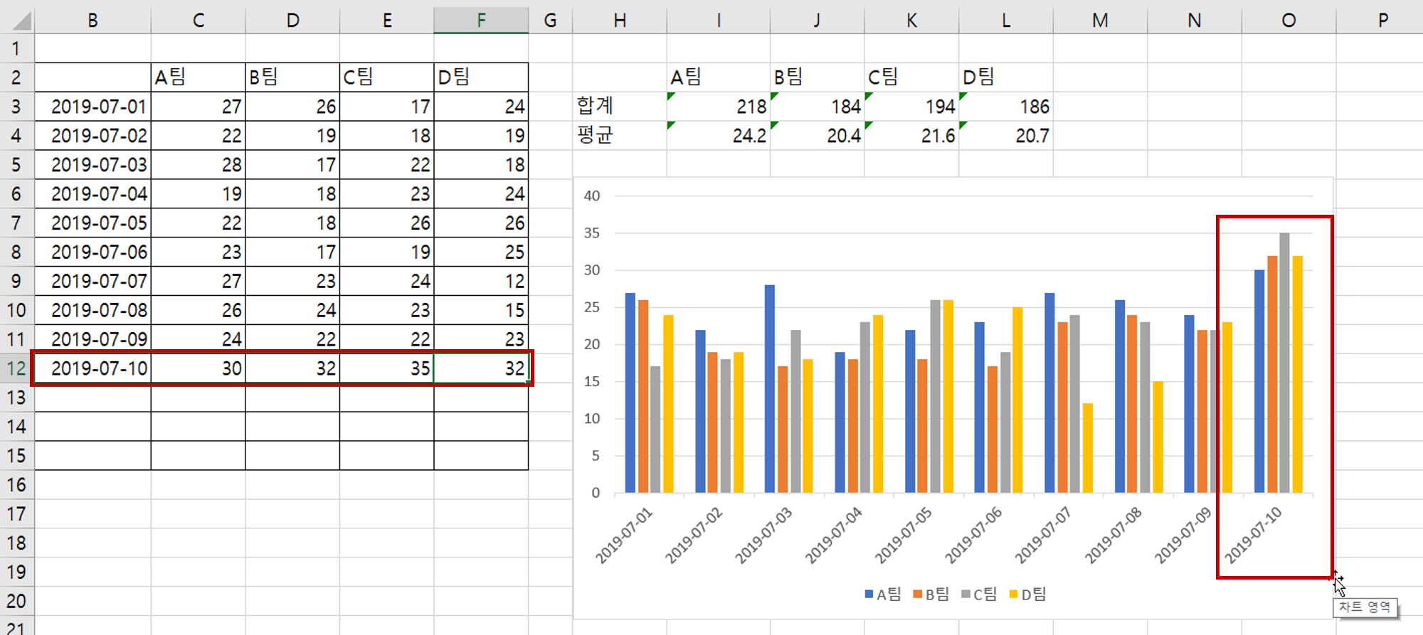 표 맨 아래에 7/10 데이터를 추가했더니(연도는 생략 가능) 오른쪽 차트에 바로 반영이 됩니다.