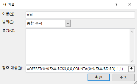 이미 팀 별 데이터 동적 범위로 이름을 지정해 두었기 때문에 바로 인수로 이름을 지정하면 됩니다.